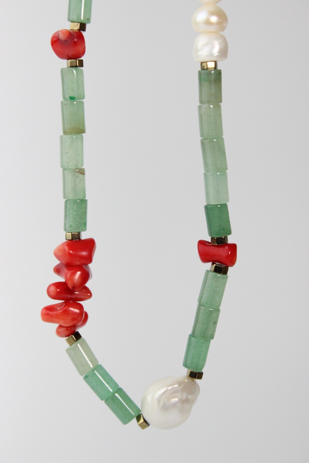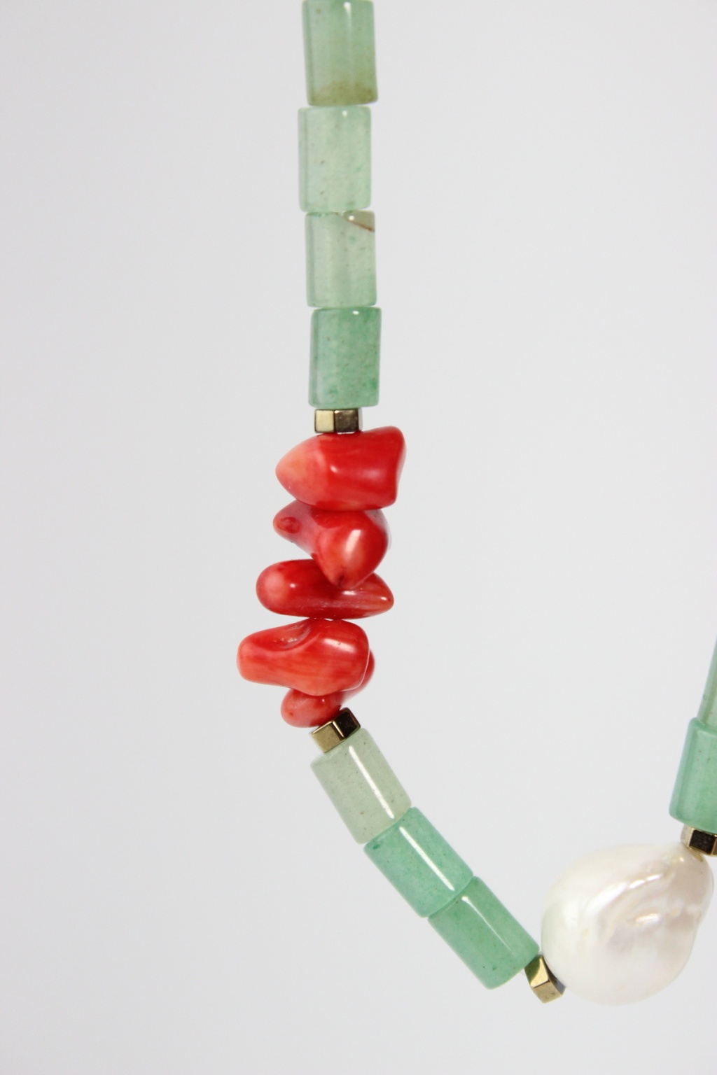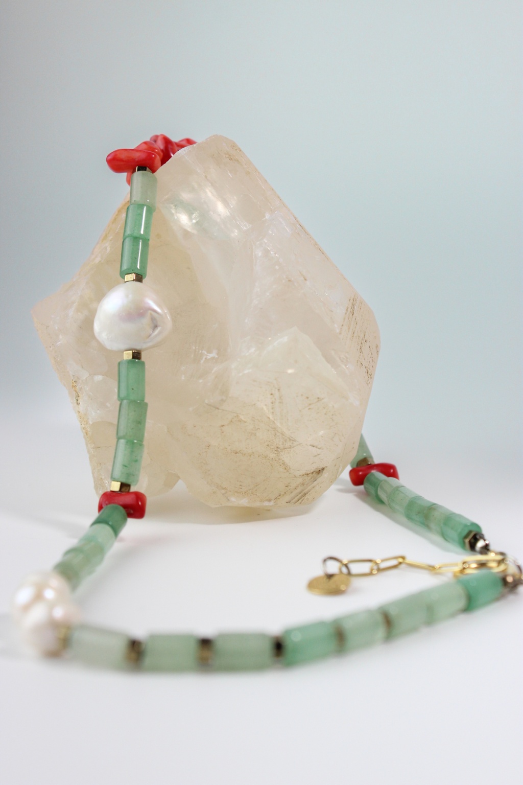 Özgün, renkli ve doğal taşlardan hoşlanan biriyseniz bu ürün tam sizin için. Enerjik bir tasarıma sahip olan Luna Kolye aventurin, kırmızı mercan ve incinin bir arada kullanılması, kolyeye hem doğal hem de zıt renklerin uyumunu taşıyan benzersiz bir hava katıyor.