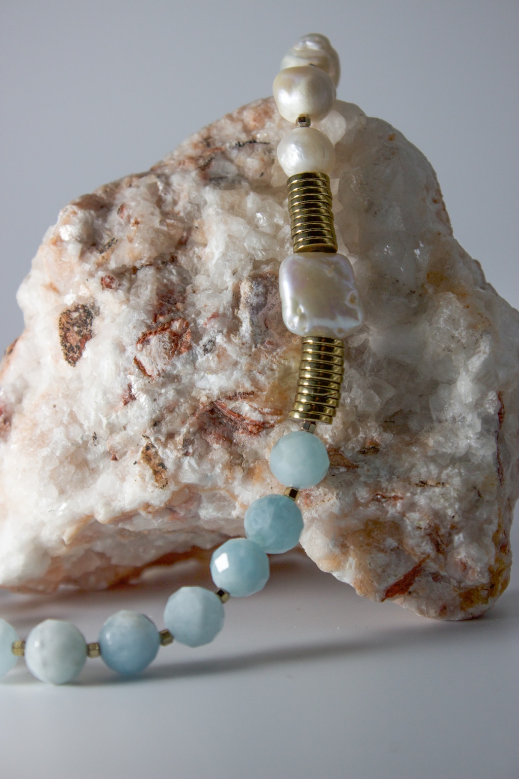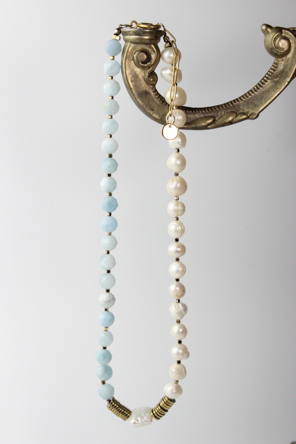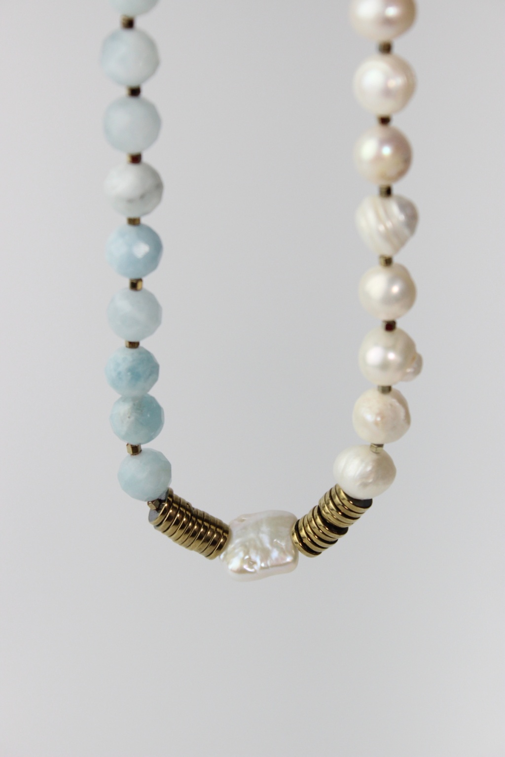 Sky Blue Kolye • Uzunluk: 40+5 cm • Akuamarin • Hematit • İnci • Çelik aparatlar (Paslanma, kararma ve alerji yapmamaktadır.; ) • %100 El yapımı Akuamarin, denizciler tarafından uğur taşı olarak kullanılmış, inci ve hematitle bir araya getirilerek denizin ve toprağın enerjisini üzerinde hissedeceğiniz zarif bir kolye olarak tasarlandı.; Kullanım Talimatı: Koleksiyonumuzda inci ,lapis lazuli ,mercan, yeşim, sodalit, ametist, akuamarin, akik, gibi doğal taşlar ve altın kaplama parçalar kullanıldığı için aksesuarların su, parfüm, krem ve alkol ile temasından kaçınılmalıdır.; Takılarınızı, ürün ile birlikte gönderdiğimiz özel Mirey® kutusunda veya kesesinde muhafaza etmenizi öneririz.; Kullanılan doğal taşların her biri kendine has özellik gösterdiği için ürünlerimizde ufak tefek farklılıklar olabilir.;